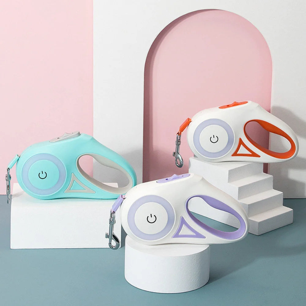 RETRACTABLE LEASH WITH LIGHT SYSTEM: The front bright LED spot lamp is visible within 5 meters in the dark; So night walks are safer and more visible to passing cars.
